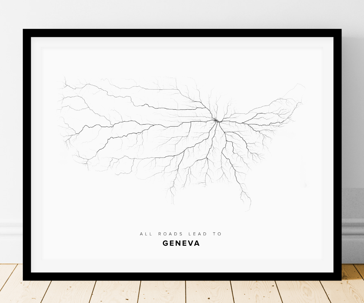 All roads lead to Geneva (United States of America) Fine Art Map Print